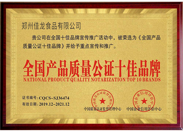歷經(jīng)二十余年發(fā)展,佳龍食品始終專注于休閑麻辣零食行業(yè),做自己擅長的事。在食品行業(yè),品質(zhì)與安全是頭等大事,佳龍品牌始終堅(jiān)持“用心創(chuàng)品質(zhì)”的企業(yè)理念,嚴(yán)格管控產(chǎn)品品質(zhì)。為了實(shí)現(xiàn)與國 際管理的接軌,佳龍全面導(dǎo)入了國際標(biāo)準(zhǔn)化管理體系,建立了ISO22000食品安全管理、HACCP危害分析管理一體化等管理體系和標(biāo)準(zhǔn),并獲得了出口食品生產(chǎn)企業(yè)備案證明。佳龍品牌先后榮獲“中國315 誠信品牌”、“全國誠信經(jīng)營示范單位”、“重質(zhì)量守信譽(yù)”等行業(yè)較高獎(jiǎng)項(xiàng)。 用心做品質(zhì),用心做創(chuàng)新,保證了佳龍產(chǎn)品的吸引力和生命力。這也是佳龍品牌能夠持續(xù)受消費(fèi)者歡迎,逐步成長為消費(fèi)者耳熟能詳?shù)摹皣衿放啤薄?